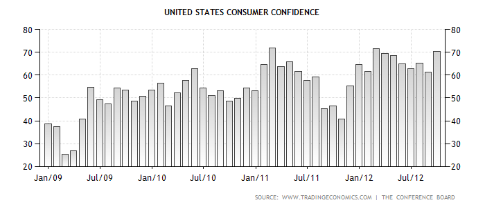 United States Consumer ConfidenceIn the United States, consumer confidence improved to 70.3 in September of 2012 from 61.30 in August of 2012. Historically, from 1967 until 2012, the United States Consumer Confidence averaged 93.17 reaching an all time high of 144.70 in January of 2000 and a record low of 25.30 in February of 2009. In the United States, The Conference Board Consumer Confidence Index® (CCI) is a barometer of the health of the U.S. economy from the perspective of the consumer. The index is based on approximately 3,000 completed questionnaires reflecting consumers’ perceptions of current business and employment conditions, as well as their expectations for six months hence regarding business conditions, employment, and income. The Conference Board® and Consumer Confidence Index® are registered trademarks of The Conference Board. The Consumer Confidence Index and its related series are among the earliest sets of economic indicators available each month and are closely watched as leading indicators for the U.S. economy. This page includes a chart with historical data for the United States Consumer Confidence. |